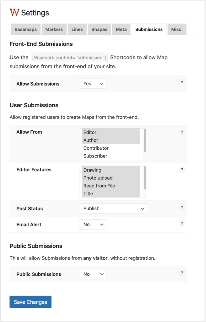 You can control who can Submit Maps, what editor features are available and whether submissions should be approved before they are published.